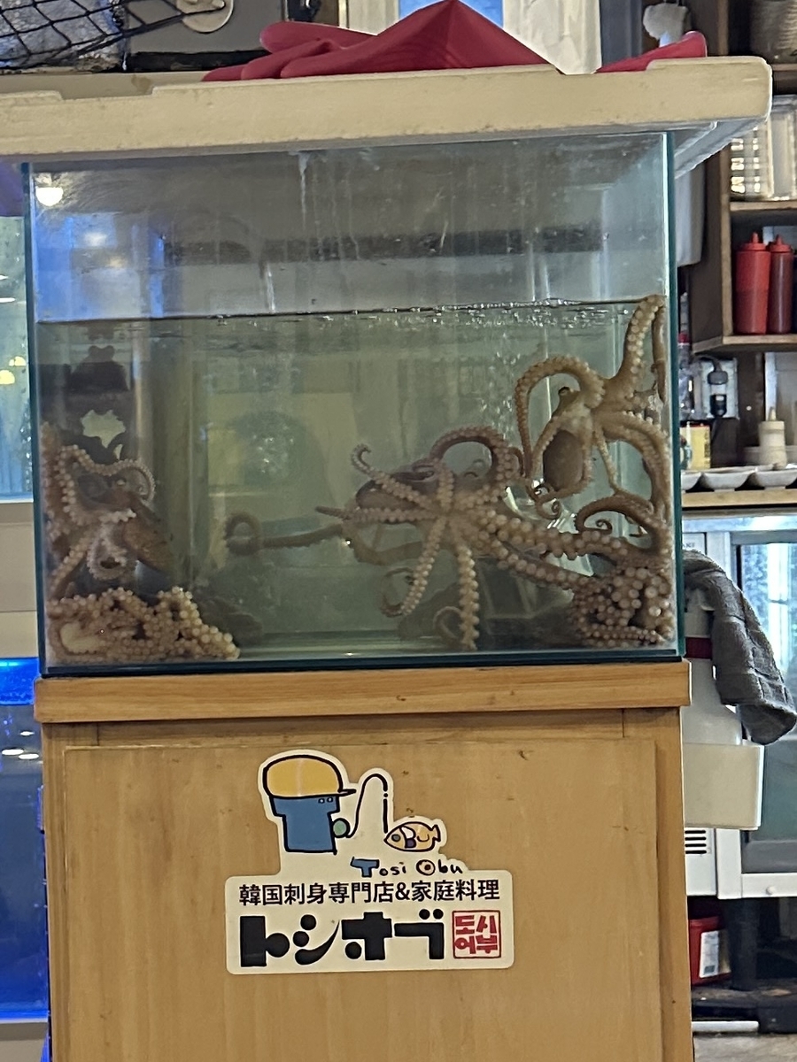 海鮮のお店みたいで、水槽に生タコちゃんがいました。